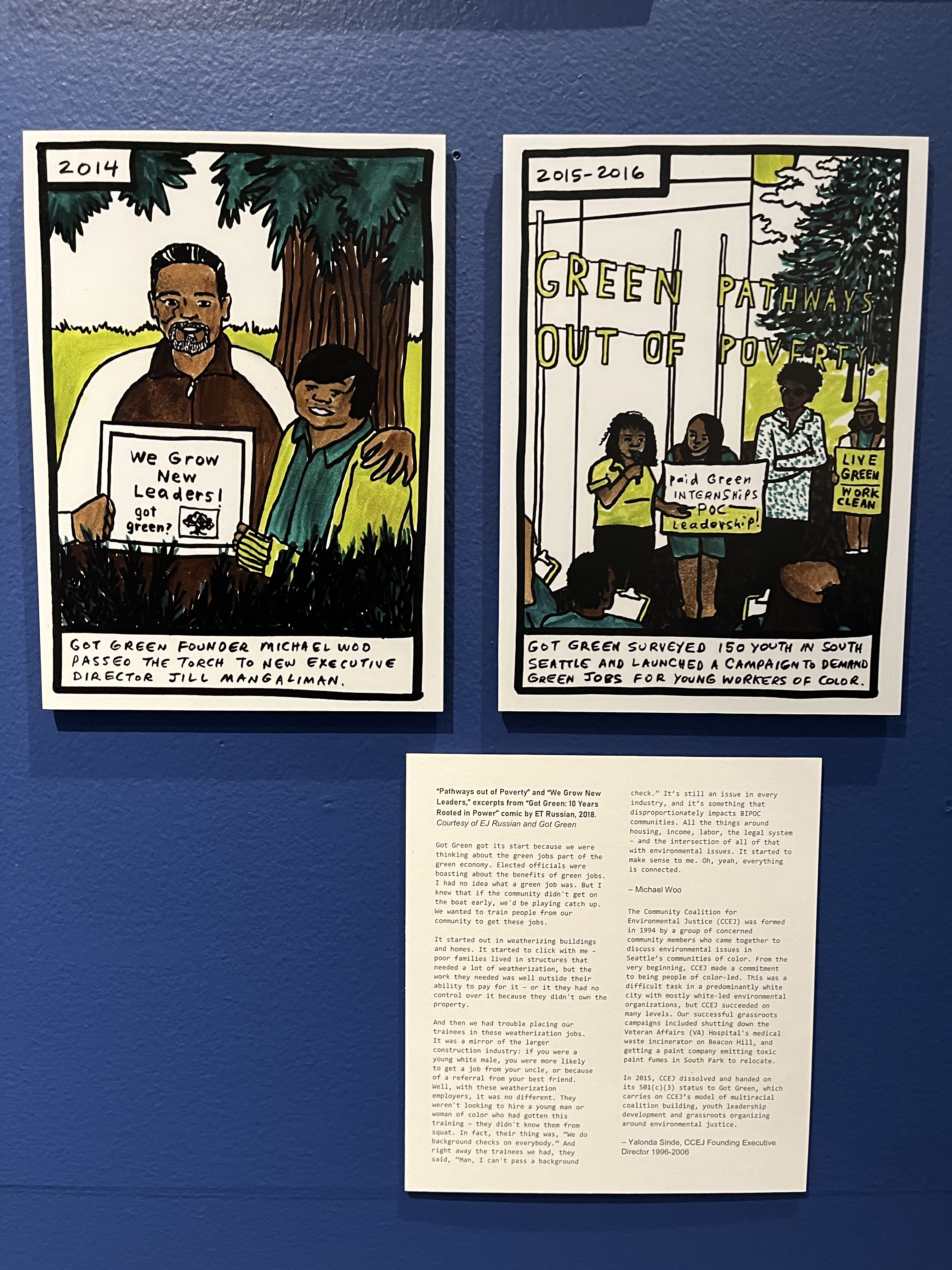 My graphic journalism was featured in the Wing Luke Museum exhibit We Are Changing the Tide (2022-2023). This exhibit featured the work of BIPOC communities in environmental justice. Content from my comic book collaboration with influential Seattle-based climate justice group Got Green, Got Green Ten Years Rooted in Power, was featured. Link here