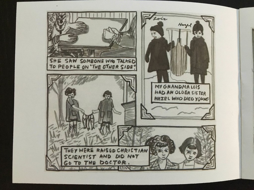 This is the first comic I ever made with grey tones in it. It’s a true story of my mom’s visit to a psychic and the wishes of my Grandmother’s sister’s ghost.