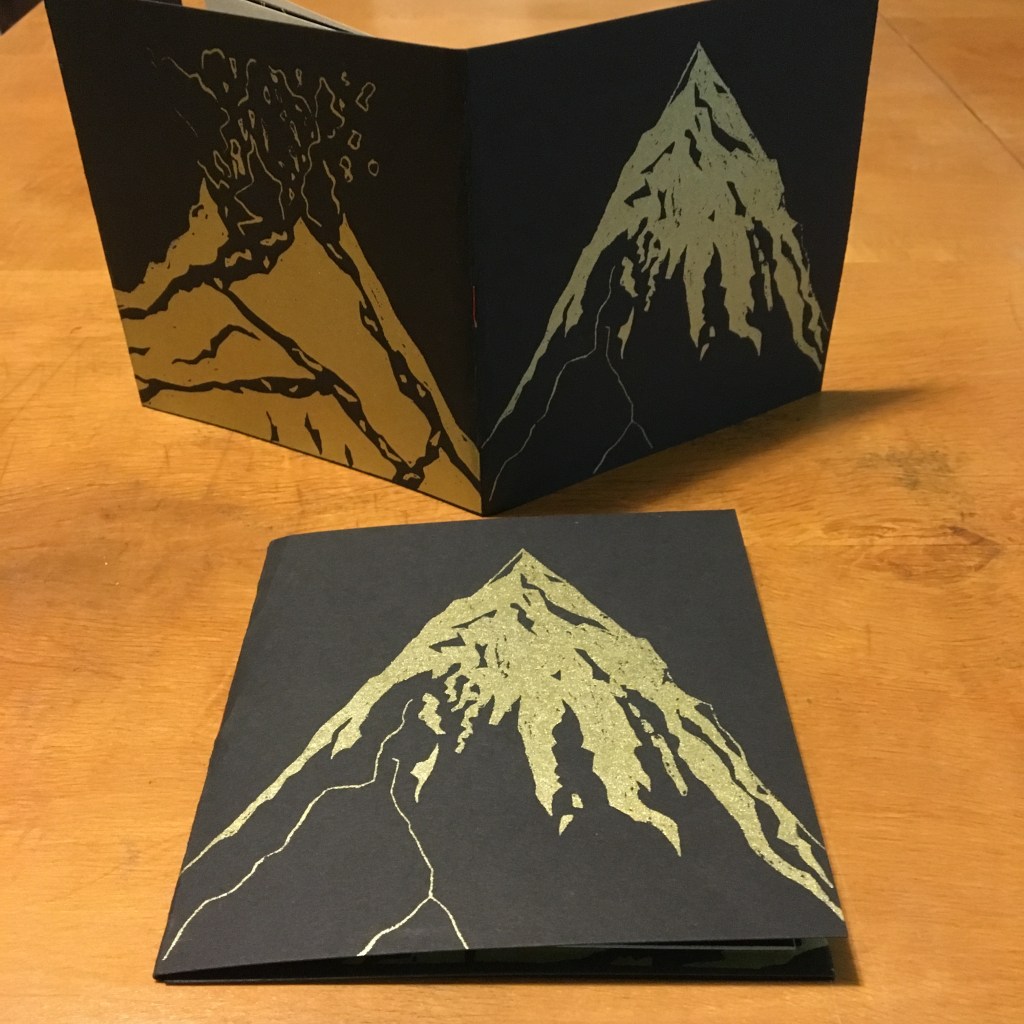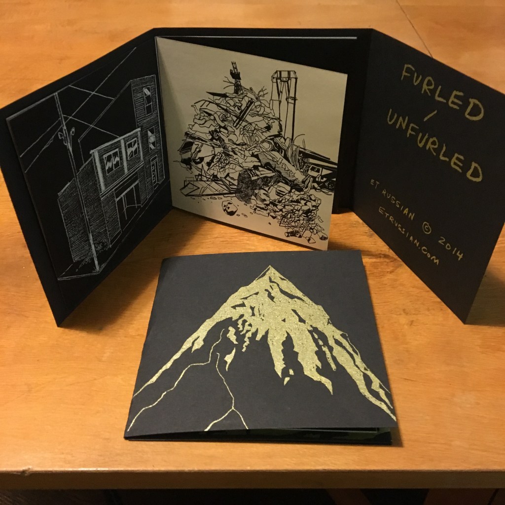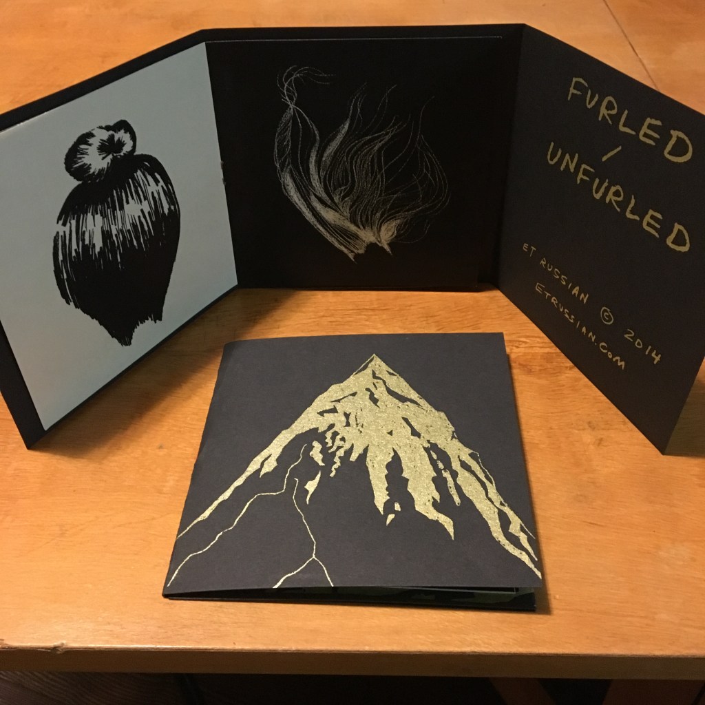 This comic has screen-printed covers in gold ink on black paper and features a series of objects both furled and unfurled.