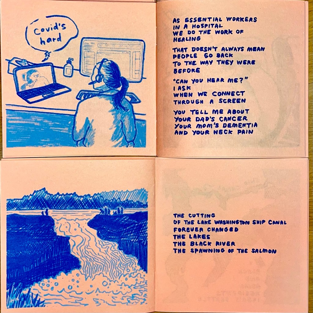 This risograph-printed comic is a reflection on living in lockdown and the cutting of the Lake Washington Ship Canal. I made this during a drawbridge residency on the University Bridge in Seattle. Read the entire comic here.
