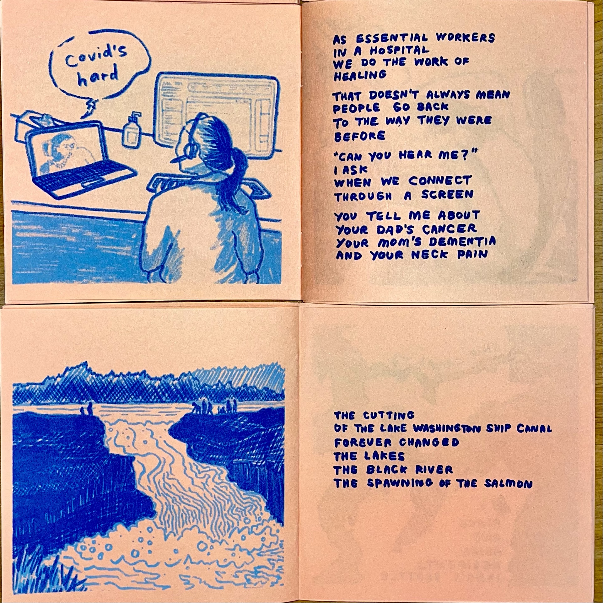 This risograph-printed comic is a reflection on living in lockdown and the cutting of the Lake Washington Ship Canal. I made this during a drawbridge residency on the University Bridge in Seattle. Read the entire comic here.